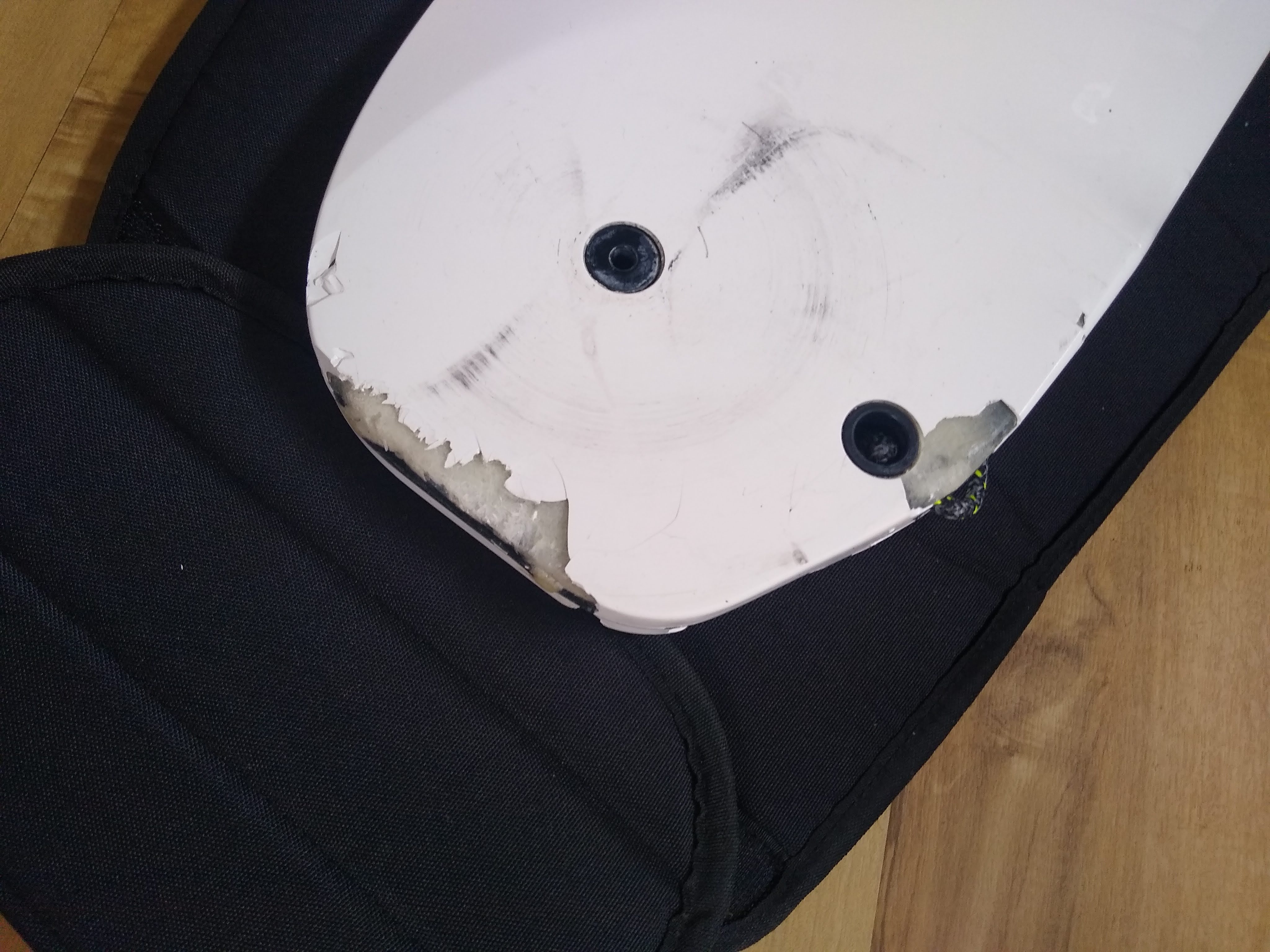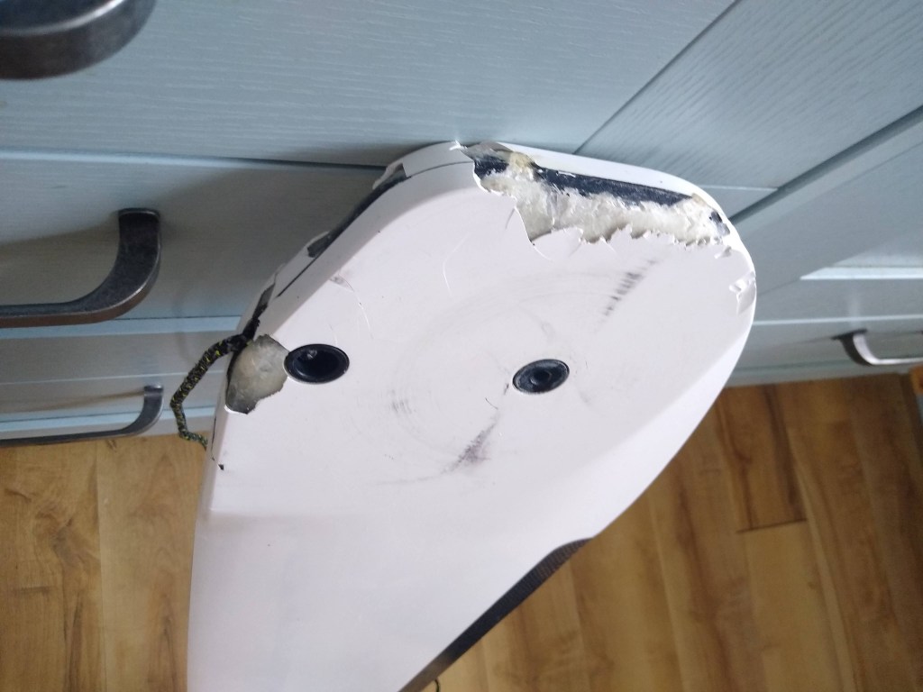 This could have been a lot worse. It was a windy day, I was sailing a 9 in a pursuit race and was clipped by a Dart 18 at the leeward mark. The rudder stock was damaged too but the boat was fortunately, otherwise fine.